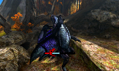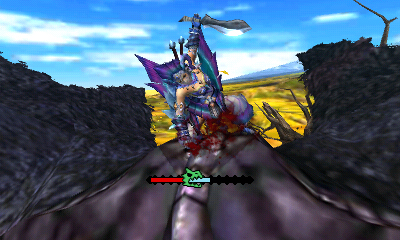 Upon landing a jumping attack, you may initiate the mounting sequence. See the green bar? That’s you; mash X or A to stab the monster repeatedly and topple it to the ground.