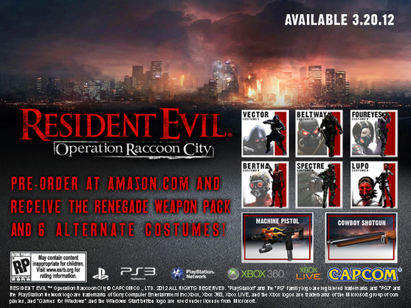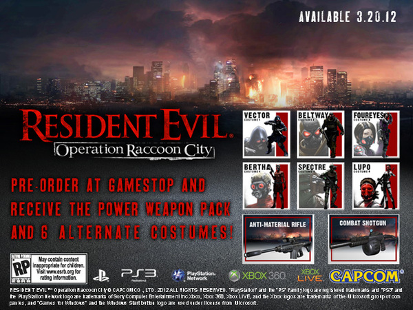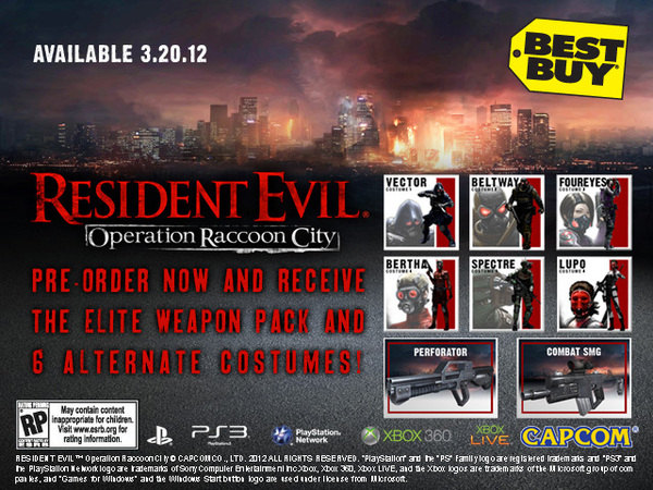 Fans who pre-order the game with GameStop, Amazon.com, or Best Buy will receive an alternate costume pack for each of the six playable characters in Resident Evil: Operation Raccoon City, along with two bonus weapons that are unique for each retailer.