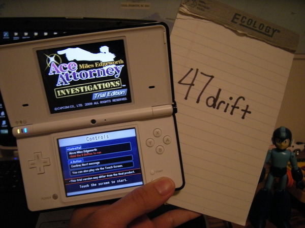 Next up, for our AAI:ME demo contest , we asked Unity members to send us pictures with their demos. The winner of that contest (and a free copy of Ace Attorney Investigations: Miles Edgeworth) is 47drift ! Congrats! His/her winning entry is over there to the right —>