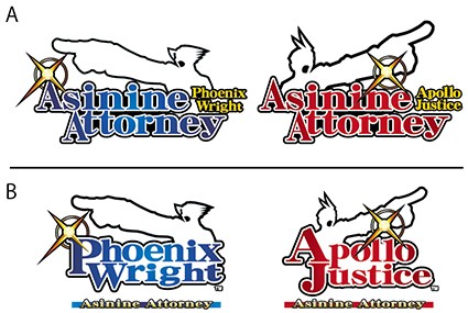 Needless to say, the terrible balance between each character’s name and “Asinine Attorney” wasn’t all that great in option A, so the original Phoenix Wright: Ace Attorney logo style it was! Now, in Apollo Justice flavor!