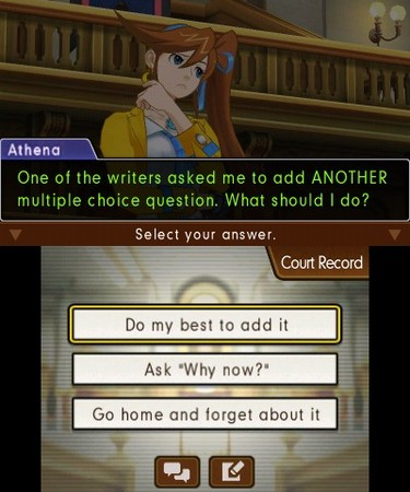 The writers wanted all sorts of things like different dialogue branches depending on the piece of evidence presented, and sometimes, just when we were pretty much done making the scripts for a section, they would ask me to add another multiple choice question…