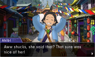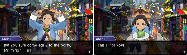 “Don’t make him look like an airhead! But make him lovable!” Mr. Yamazaki had ordered. Fulfilling such an order required a little extra attention from us in how Ahlbi expresses himself. We scripters had to pay attention to not only how Ahlbi responds to Phoenix in terms of his reaction animations or even the occasional serious facial expression, but also in terms of his emotional response to Phoenix. We express those nuances through the addition of sound effects like *smack!* *slap!* *thud!* and screen effects like flashing and screen shaking to his dialogue, though it took a fair bit of trial and error to make sure we were conveying exactly what we wanted to each time.