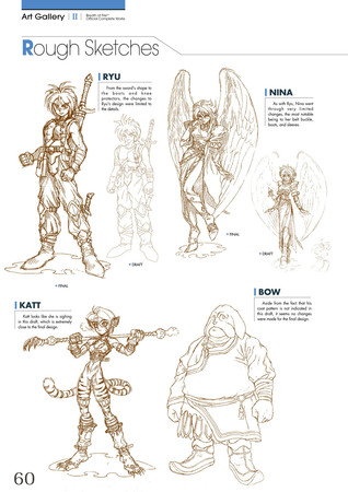 Now celebrating Breath of Fire ‘s 20+ years as a franchise, this book compiles art from all Breath of Fire games, so you get to enjoy tons of character art (dat classic 90’s Capcom art style!), early concept ideas and more. Check out some preview pages below: