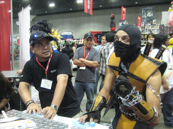 It was amazing to see how we went from a massive booth at E3 to a small booth that housed six kiosks at AX showcasing Tatsunoko vs. Capcom. Everyone was excited to get their hands on Tatsunoko vs. Capcom, including Scorpion of Mortal Kombat fame pictured with Capcom’s very own, Randy: