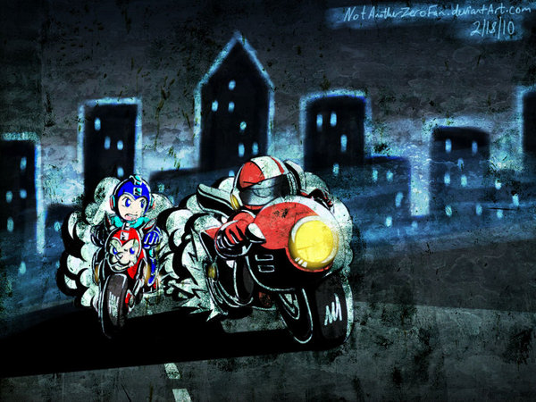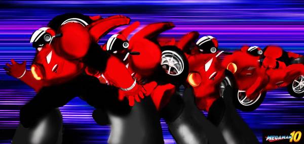 Seth ( s-kill ): I liked the sense of action and nod to the Transformers in Splicebot’s piece, but mostly it was the watercolor-ish treatment that really sold me. It makes Nitro Man look dangerous and slick, like his outline is blurred from heat and motion.