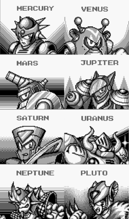 So what replaces the Robot Masters? Why, the Stardroids, spacefaring beings who are (of course) at odds with Mega Man. They’re led by Terra, who menaces Mega Man in an opening cutscene; Mega Man is unable to hurt – much less defeat – Terra in his current state, which prompts Light to create the Mega Arm.