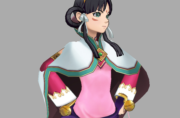 We created the characters for Spirit of Justice as 3D polygon models, but in the end, they are displayed on a Nintendo 3DS screen. This means that even though we pose and create animations for the characters with a 3D rendering tool, sometimes, the characters wind up looking a little different once we see them on an actual Nintendo 3DS. For example, compare the two versions of Andistan’dhin below.