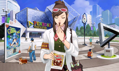 The Snackoos bag didn’t look so bad in the original DS version when we simply removed the Japanese lettering, but when Ema and her bag of snacks became all pretty in HD for the Nintendo 3DS, well, it looked a little sad and lonely with nothing written on the front label, so I asked Mr. Ueda to design and create the Snackoos bag you see in the game today. Taking inspiration from American packing design, he made it lively and colorful while keeping it simple by featuring the Snackoos front and center. He even designed it so that the word “Snackoos” is still visible when Ema is behind the witness’s stand! (How cool is that!)