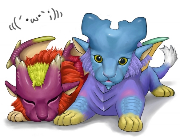 There’s even a pic of a Teostra and Lunastra in a much less threatening appearance… You know, now they look kind of lovable and such instead of the usual ” ima-nom-your-face-off ” look.