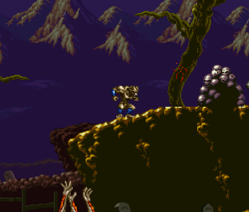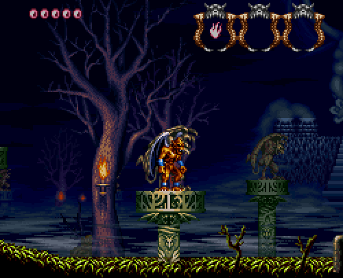 A big thing that stood out for me when I played Demon’s Crest for the first time was its soundtrack. Composed by Toshihiko Horiyama (Mega Man X4, Apollo Justice: Ace Attorney), the music is rightfully moody and dramatic thanks to the heavy use of organ. Listen to the first level’s track “Beyond the Colosseum” and try not to be whisked away into a decrepit, macabre world where ghosts ‘n goblins rule and humans drool.