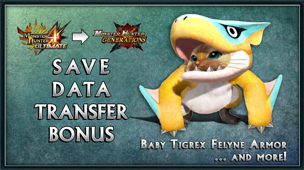 Start your MHGen journey with an assortment of useful items and this exclusive Baby Tigrex armor set for your Felynes, if you have MH4U save data on your Nintendo 3DS. It’s a super cute rendition of the Tigrex based on the Japanese release Poka Poka Airu Mura DX, and you can only get it by having MH4U data on your system.