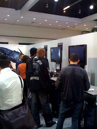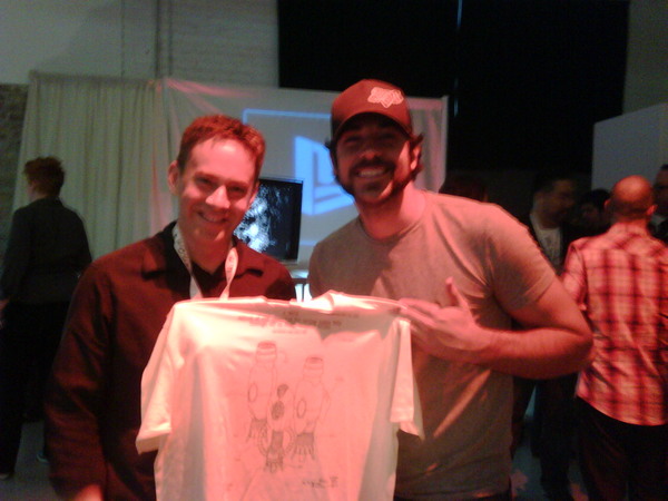 Jonathan Holmes caught Jon Heder , aka Napoleon Dynamite, sporting e3’s hottest swag: the Tatsunoko vs Capcom shirt .