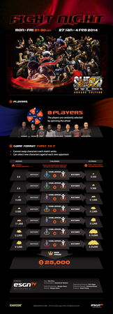 What do you think would happen if you took eight of the best Super Street Fighter IV: AE 2012 players from around the world and had them battle it out for a chance at $25,000 US. Now what if you changed the format from a typical two out of three tournament format, to a first to seven series, yet gave the players the option to avoid battling against the opponents who may get in their way? Sounds like it could be pretty crazy right? Well, the fine folks at ESGN have put this model to work, resulting in some of the most intense Street Fighter matches ever recorded.