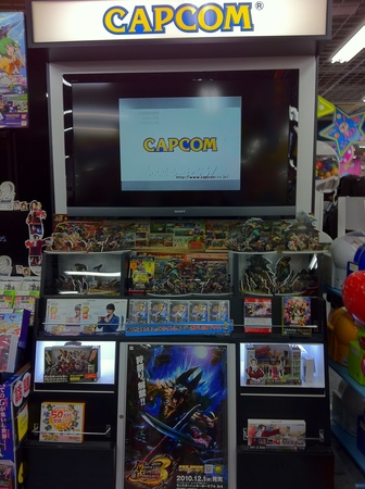 Between the two titles, Capcom continues to have an ever strong presence here in the Japan video game scene. In fact, you cannot walk into any one of the several electronic stores here without seeing a display (or two, or three) or some kind of advertising for Monster Hunter Portable 3rd or Gyakuten Kenji 2. Below is one of the several displays that one can find in Yodabashi Camera. This display not only features a large TV with looping trailers and several pieces of key art, but also has space to show sample product, two small cases with mini cardboard models of the game’s monsters, a small section dedicated to Monster Hunter Frontier (X360), and another small section set aside to cross promote Gyakuten Kenji 2.