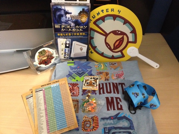 Yep, win this raffle and you take home an MH3U lanyard, MH3U cheat-sheet, MHFesta’08 sticker set, MHTri Wii remote sticker set, MH4 Yian Kut-Ku fans from TGS 2012, MH3U blue “Hunt Me” shirt (M, L, or XL) and the Airou dressed in a monkey suit keychain!