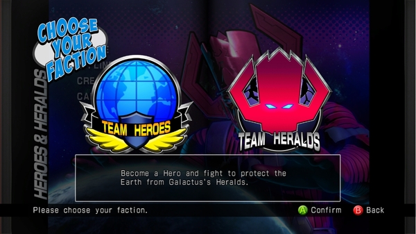 First off – what is Heroes & Heralds mode? A sizeable update that adds a deep, customizable new angle to online and offline play. Each time you begin, you choose a faction – either noble Heroes or silver-colored Heralds of Galactus – and engage in a series of battles with the opposing side. Online battles pit you against human opponents, while the offline mode has you scrapping with AI teams.