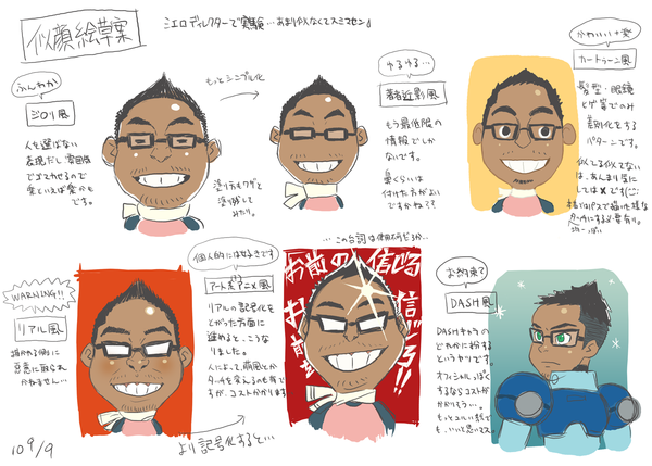 Incidentally, the above image shows the evolution of Director Eguchi’s caricature. I draw all the caricatures for our dev team’s staff blogs. For kicks, I also experimented with a variety of other ideas, such as Director Eguchi in a blue Mega Man suit, but we ended up using the upper-middle image.