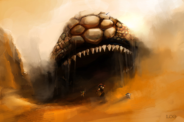 Now this uncommonly large Nibelsnarf is probably inspired by one of the Japanese event quests, in MHP3rd … still, the artist did an awesome job in capturing a moment of desperation like this!
