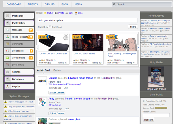 If you’re new-ish around here, maybe you’re asking, “WTF are Unity Points?” Welp, they’re a sort of website currency exclusive to Capcom Unity. After you’ve registered and logged in, click that Dashboard button on the top bar and you’ll come to the screen you see above. From there, you can access many points of the site, including the carousel of latest stories, the latest forum posts from the groups and friends you follow and, if you see it in the right column, your Unity Point and Unity Raffle boxes. “My Spendable Points” is the key number – that’s how many you can throw at our upcoming raffles.