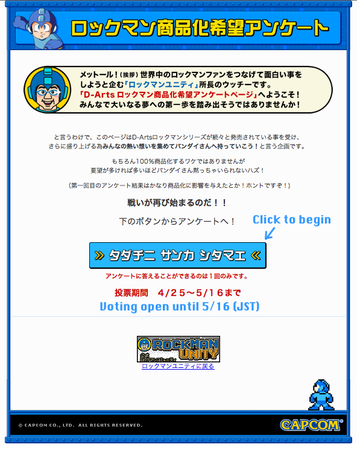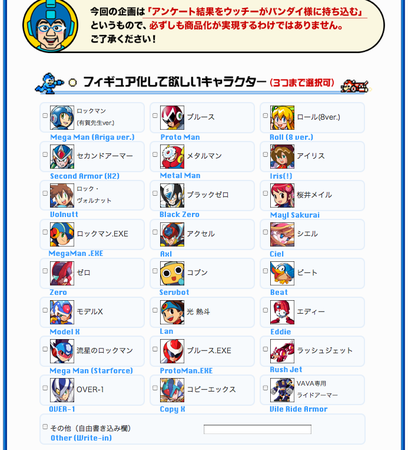 Anyway. You may have already caught wind of this over on The Mega Man Network, and don’t think I’m not salty about that. But in case you haven’t, our friend Ucchy over at official Japanese Mega Man blog Rockman Unity recently posted a big ol’ survey to see what Mega Man characters you’d like to see made into awesome D-Arts figures. Full details and a translation guide after the jump!