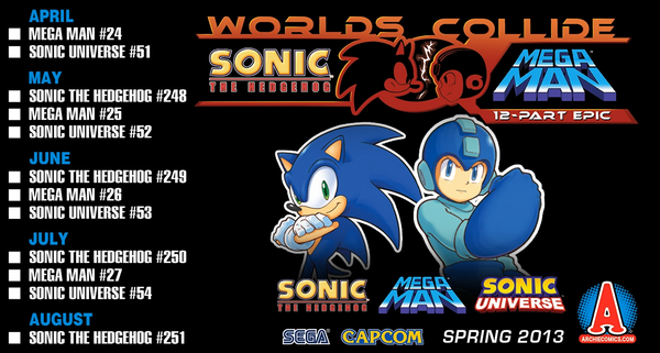 First teased at SDCC 2012 , the “Worlds Collide” crossover comic series is finally here! Today Mega Man #24 is available in comic shops, with Sonic Universe and Sonic the Hedgehog comics continuing the tale (along with more Mega Man issues) throughout the summer.