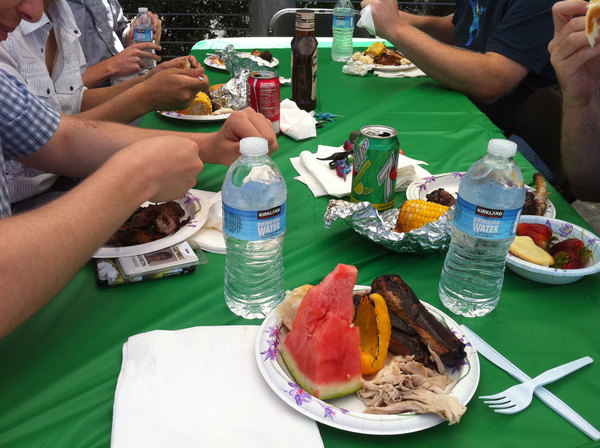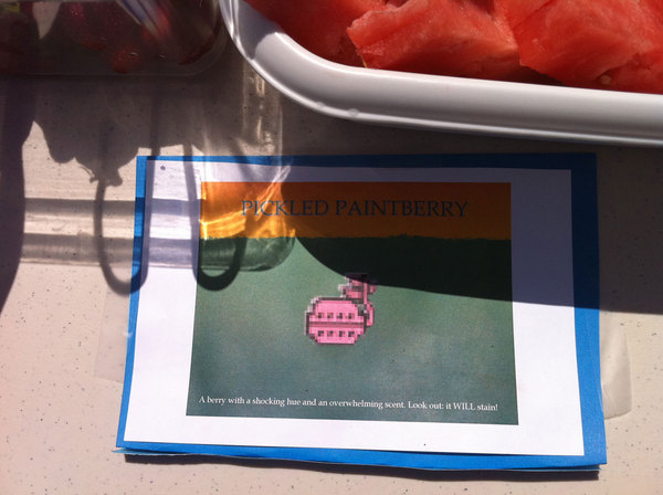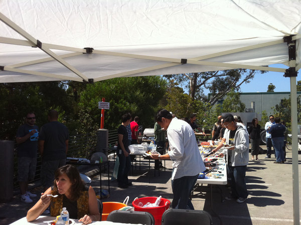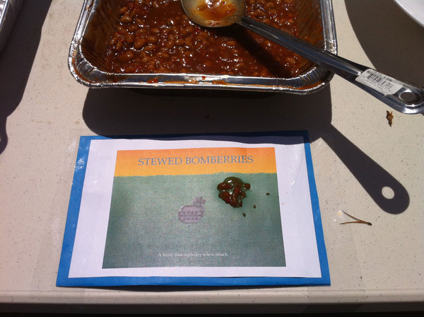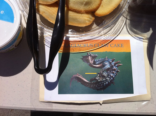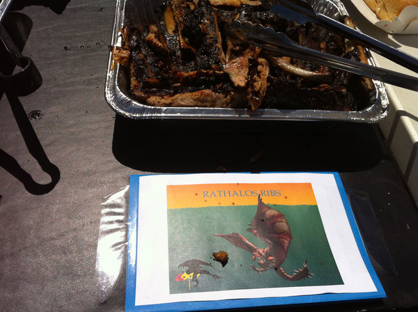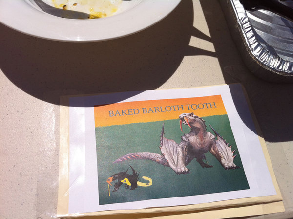 This afternoon at Capcom HQ we had ourselves a little Monster Hunter themed BBQ! Rathalos ribs, Qurupeco Gizzards, Grilled Excite Shrooms, Baked Barioth Teeth, Stewed Bomb Berries, and more delicious things all themed from Monster Hunter. All the food is gone, but I did manage to take a bunch of pics on my iPhone to share. Enjoy!
