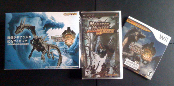 The contest starts now and ends on Thursday April 8th. On Friday April 9th we’ll post the three winners, and of course send them a prize pack. Winners will receive a copy of Monster Hunter Freedom Unite for PSP, a Monster Hunter Tri demo, and a Lagiacrus Fossil model. Send your entry to THIS GUY with “MH Quest” as the subject line.
