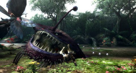 The new areas are looking like a blast to explore, showing off some areas in the forest and swamp. The monster shown reminds of a giant angler fish crossed with a puffer fish. Except, you know, WAY bigger. You can see him in the screens, but you can also see him in action against hunters on the official Monster Hunter 3 Japanese site . There’s trailers and commercials to watch that really bring out how cool and massive this game is.