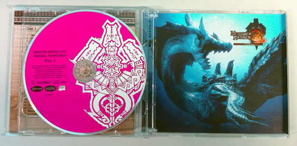 The Monster Hunter Tri soundtrack is finally localized! We’ve been working very hard to get this produced in a great little pack, with cool design and art accompanied by the amazing soundtrack. It’s a two disc set, literally as full as we could make them. Disc 1 has 29 tracks, and Disc 2 has 23 tracks. It’s got everything from the epic main themes, right down to the fun stuff like the BBQ music. And heck, both discs are pink! My favorite color.