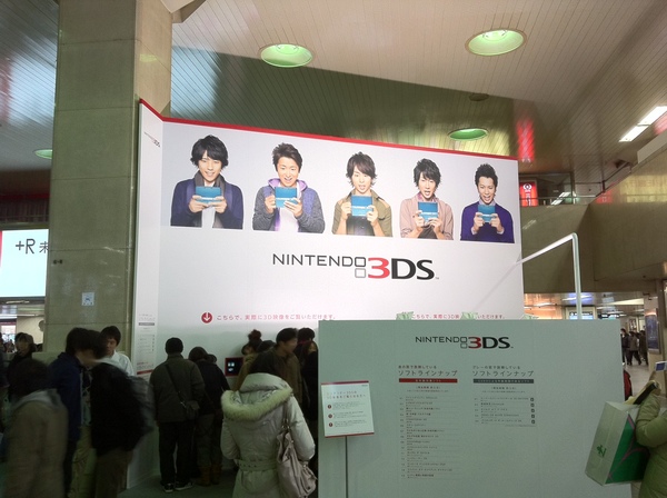 And last but not least, they put up this large Nintendo 3DS interactive booth at one of our major stations, Umeda. There are about 8-10 devices set up behind glass and people are free to walk up and try to experience the 3D technology. Trailers for several titles, including Super Street Fighter IV: 3-D Edition and Resident Evil: The Mercenaries 3-D, are running and they are fun to look at if you can fight through the crowds. As for the spokespersons, those of you that listen to j-pop or watch any Japanese dramas will know right away that this is the signing group, Arashi. Their faces are everywhere in this city, as not only are they on all the posters and commercials for the Nintendo 3DS, but they are also the new spokespeople for KDDI Au (one of the major phone carriers here) to promote their new Android devices. At any rate, it looks like the Nintendo 3DS, like all handhelds in Japan, is going to be a big seller and the hype doesn’t seem to be going away anytime soon.