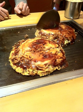 Luckily, a friend of mine from the States had moved to Osaka a few years back and so he has been showing me around the city. Everything from Osaka Castle, to the best places to shop, and of course, he took me to places with awesome food. Tako-yaki (fried octopus balls) and okonomiyaki are some of the foods that Osaka is famous for and oh my are they delicious. My favorite is the Osaka take on traditional Okonomiyaki. Normally, this is a mixture of cabbage, batter, egg, and various meats that are formed into a pancake shape and cooked on a hot plate in the center of the table. Once cooked, they then slather on a layer of sauce and mayonnaise. And while that does not sound awesome enough, in Osaka they add another component to the whole recipe, Yaki-soba noodles! As you can see in the picture here, it ends up being quite a large amount of food that can usually be split between a few people. This one in particular had a decent mixture of chicken, pork, shrimp, and oysters. Delicious! And if that wasn’t enough foodage for you, check out this ground pork and eggplant curry dish and the chestnut banana cake tart. Its embarrassing, but I had to practically had to stop myself from drooling…