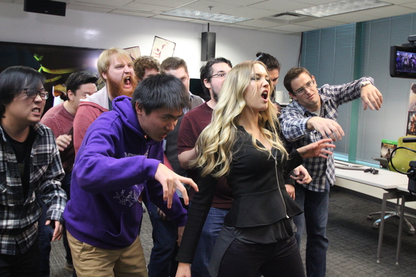 Next up was the reason she’d come to us in the first place: Zombie Boot Camp. Trant, who had played a zombie the week before, explained the zombification process and how to act and move while she was searching for fresh brains to eat. Then the Capcom Vancouver Zombie Extras entered to help her get into the character as part of a zombie horde.