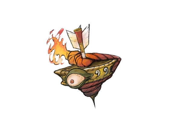 A fiery spinning top is usually taken as an ill omen. More so when it has a large demonic eye at its center such as Fire Eye. Legend holds this demon was once a boy who had failed to notice a fire engulf his house, and then him and his top as well.