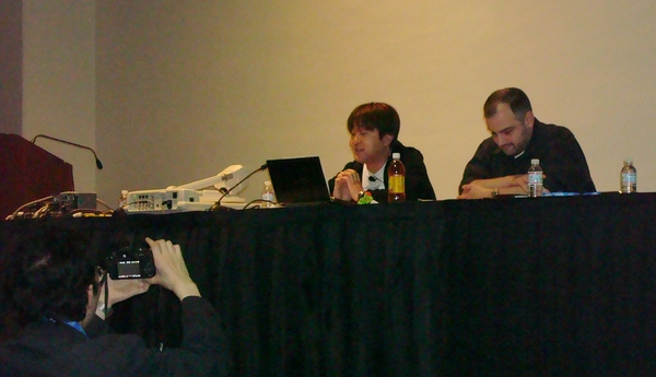 The mercurial Ono-san (accompanied by AP David Crislip and a tiny Blanka doll (barely visible in the pic below)) descended on the Game Developer’s Conference yesterday to shake hands and talk background on how SFIV came to be, some of the core concepts that guided the team, and resurrecting a genre-defining franchise while living up to high player expectations and honoring their memories.