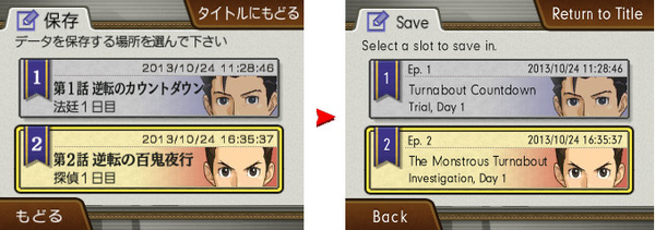 We moved some of the text around to make better use of the space on-screen because of the length of the words in English. For example, the “Ep. 1” (第1話) was moved up because the titles of the episodes themselves are longer in English. We also had to add spaces after the “Trial” and “Investigation” text strings in the localized version since you don’t need spaces between words in Japanese grammar. (In fact, it’s actually really unnatural to have spaces between words unless you have a specific reason.)