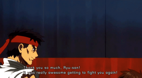 In Street Fighter Alpha 3, she continues the search for Ryu with her sensei, Dan, meeting Blanka during their travels. She eventually finds him under the control of M. Bison who seeks to unleash the “Hado of Murderous Intent.” As M. Bison is about to attack Sakura, Ryu snaps out of it and destroys him temporarily. No longer seeing her as a nuisance, Ryu decides to part ways without fighting Sakura as he still believes he has training to do. Sakura agrees to this and promises the next time they meet, she’ll become ten times stronger.