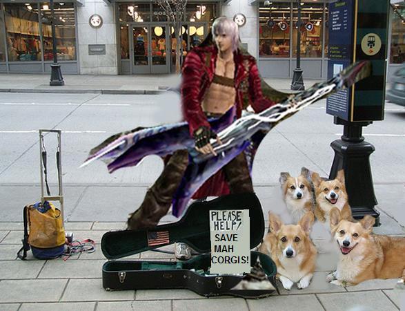 Dante rockin’ out with his Nevan electric axe, all in the name of saving an adorable pile of (Welsh?) corgis!!! Good to see this weapon being used for something peaceful. And well, you can’t really argue with corgis, now, can you? Congrats to HammerShark , who will receive a shiny new Blu-Ray of the Devil May Cry anime series in its entirety.