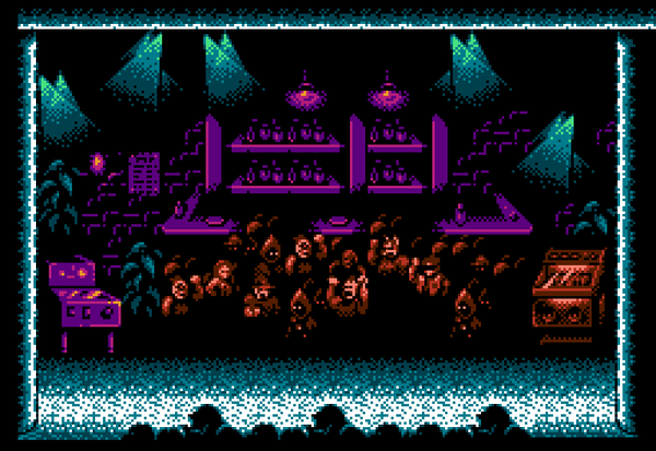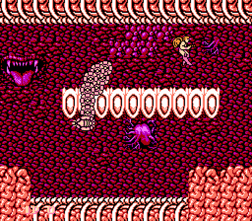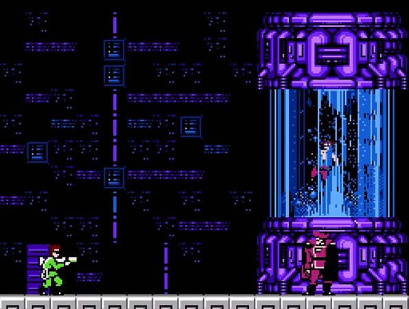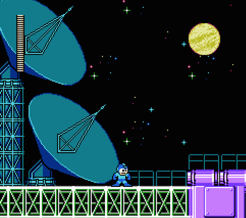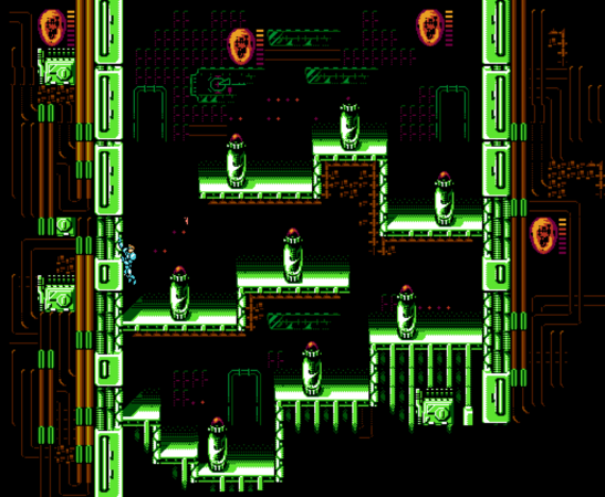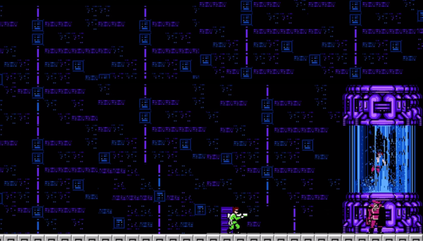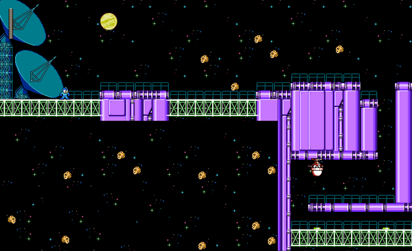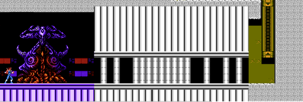 The Nintendo Entertainment System, guys, amirite? At age thirty I still don’t know what a “bit” is, but apparently you only need eight of them to create an infinite number of infinitely deep, dark hellscapes; vivid worlds cloaked in thick, oppressive atmospheres that creep and sprawl through your imagination like spiderwebs through a horrid countryside tunnel. Sure: the NES library in its seemingly endless vastness had its light-hearted selections. We all remember the Noid. But it had a particular knack for generating dark worlds filled with foreboding. Maybe that creeping dread wasn’t purely a product of the physical worlds depicted in the games themselves. Maybe it was because games were so hard back then. Maybe it’s because most backgrounds consisted of endlessly repeating patterns and there’s something inherently, terrifyingly, mechanically alien about that. Maybe it’s because the edge of the screen worked as though it were the merciless edge of existence—events and encounters that occurred elsewhere mere moments ago were immediately forgotten, nullified. Maybe it’s because the NES’s color palette had, like Chicago before it, so damn many blues. Maybe it’s just because I was an overimaginative kid (though that, I feel, is an oxymoron). But I have faith that I’m not the only NES player who felt and still feels this way. Just look at these foreboding NES backdrops and setpieces. There is perhaps no Capcom NES game more synonymous with “hellscape” than Street Fighter 2010, a game about warping to alien planets in an alien galaxy and doing lots of backflips. I know, I’ve been talking about this game a lot lately. I do not apologize. On quite the contrary: You’re welcome. At one point in the game, you warp into the cold, soulless lair of “Electric Tommy,” an equally cold and soulless robot-like entity equipped with an electric coil. The lair is a nonsensical maze of blinking bulbs and machinery of unimaginable function. The background sprawls beyond the traversable confines of the level, and shadowy doorways suggest this is just part of an impossibly expansive, impossibly expensive complex. It boggles the mind to ponder what this place is even for. Another stage of the game places you in a dingy, seedy dive bar confined to a single screen. Unseemly hooded creatures with beady eyes and other drunkards watch on excitedly as you battle to the death with an armored gorilla man. I wonder if that pinball machine ever really gets any play. The shoot-‘em-up Legendary Wingsswitched intermittently between overhead and side views. The gateway signifying this switch was none other the gaping robo-demon pictured above. You and your wings would have to be the stuff of legends to venture into the mouth of this thing, not just once, but once per stage. Just look at that impossibly black mouth. What lurks within, no one knows. ↑ Turns out it’s filled with an endless wall of guts and faces. One of the final encounters of Bionic Commandotreats you to what is my favorite screen in all of NES gaming. In games built out of repeating tiles, the occurrence of a unique, singular image meant you were officially experiencing Something Important. The nefarious “Master-D” awakens from his long sleep within a massive, fluid-filled chamber. The also-nefarious Generalissimo Killt stands indignantly before you. A wall of incomprehensible dots and lines extends for unknown lengths in the background. Are those lights? Pipes? Wires? Secret morse code? (Actually, I looked this up; if it is morse code, it says “AAAAAAA,” suggesting that yes, it is morse code.) All of these elements are unique to this one moment in the game. In its time, this moment was as powerful as any modern-day stinger or plot twist—arguably even more powerful, since your imagination was doing so much more work. ↑ In my head, these kinds of backgrounds always extended infinitely. Only the power of evil itself could have built a place like this. One of the reasons I love the NES version of Strider so muchis that it maintains this dark, atmospheric aesthetic with futuristic landscapes thick with blue-purple hues and laden with bizarre technology and setpieces whose abstractness stimulates the imagination. ↑ Zain is allegedly some sort of tree, but there’s a lot of twisted stuff going on in this bizarre form. Are those fallopian tubes? ↑ Yggdrasil, the final threat, is even more nightmarish than the other trees. Are those faces? Plus: more unexplained technology filling the background. ↑ I’m particularly fond of this design. This is the Blue Dragon, which, somehow, is a ship. That blob shooting out of it is Strider Hiryu himself. Which begs the question: Why does he need a ship?! You decide! Mega Man games tend to have a lighter aesthetic with their cartoony-eyed, comically impractical robot creations, but there’s still something about the implied vastness of the stages that oozes atmosphere. Each stage is a pure, undistilled, and seemingly boundless (in that you never see the boundaries) manifestation of a theme, be it electricity, gravity, or, uh, “guts.” Snake Man’s stage in Mega Man 3 is, on closer inspection (or technically, further inspection), made almost entirely out of murderous robot snakes. The larger snake whose head is in the upper right, for example, extends several screens below and on into the infinite. The background of the stage is also comprised of a repeating scaly pattern. Is this, too, the body of some unfathomably enormous snake-bot?? And what inhabits the unseen areas that the stage wraps around? You decide! ↑ The later games in the classic series introduced more distinct—though basic—setpieces in each stage. Star Man’s stage in Mega Man 5 begins with this rad shot of a pair of satellite dishes and the moon. ↑ I stitched together some screens from the stage and added the implied space in the bottom left just to see what it’d look like. Pretty epic, huh