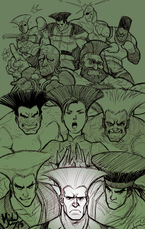 Michael sketched this delightful picture of the SFII gang, all sporting the Guile hair save for the two characters who’ve fallen to the same fate as ol’ GregaMan here. Ah well. Maybe they can use their head-shine to blind opponents.