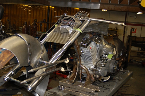 Check out the forward profile of this machine — wicked. I like the louvered vents on the LED headlights. The segmented armor over the wheels is hotness; It’s like the chopper is riding on two gigantic, undoubtedly pissed off armadillos. The chopper is still a few weeks away from completion, so a lot of the roughness of the construction is going to slowly start fading out (like the weld spots on the wheel armor) as the finish is completed.