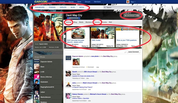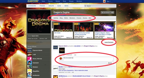 Anyways, also notice the highlited set of buttons below the group name. Those pertain to the page you’re currently viewing – in this case, the Dragon’s Dogma group page. Everything you click there will take you to the corresponding areas or display content within that particular page. Try it out; and remember it’s not exclusive to group pages… it also works on user profile pages.