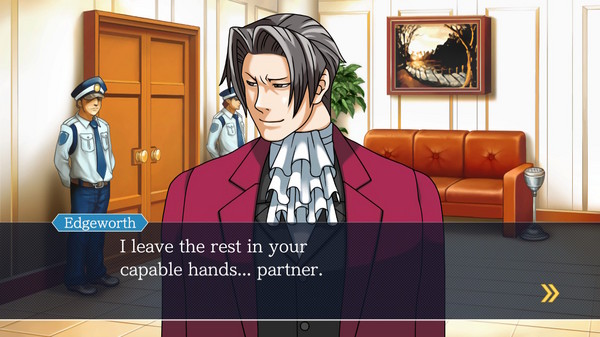 In translating this line, it was tough to get the nuance just right because, in the Japanese text, he says it kind of offhandedly (in that Edgeworth way that he does). But, due to the context in which it’s being said, it also has a strong underlying nuance of “I trust you to see this through to the end.” I could’ve translated the line more generically as: “Now… the rest is up to you… partner,” but to me, the standard translation “the rest is up to you” can also be interpreted as a very neutral “I’m passing the baton on to you” without the sense of “I believe in you / I trust you” that the Japanese implies. So, I decided to make that nuance a little more explicit with my word choice in the English.