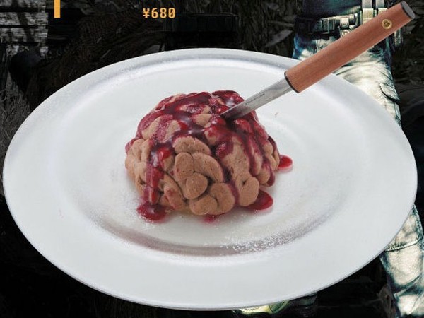 BÔNUS – Sobremesas oficiais vendidas somente no Capcom Bar, no Japão 😀 Waffles do Blue Badger (Phoenix Wright) e “Bolo-Cérebro-de-Licker” do Resident Evil.