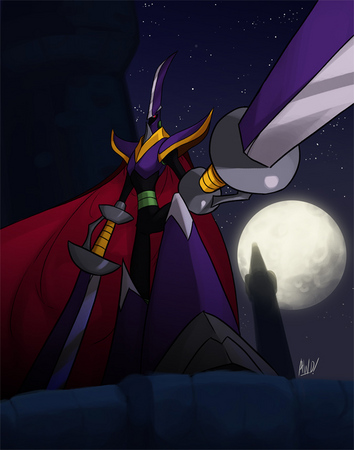 AWD!’s piece looks cool! The night time setting, moon background, and castle work really well! I really like the cape that AWD! added. I get the sense, from this piece, that this Blade Man likes to talk a lot but when the time comes, he’s pretty decisive.