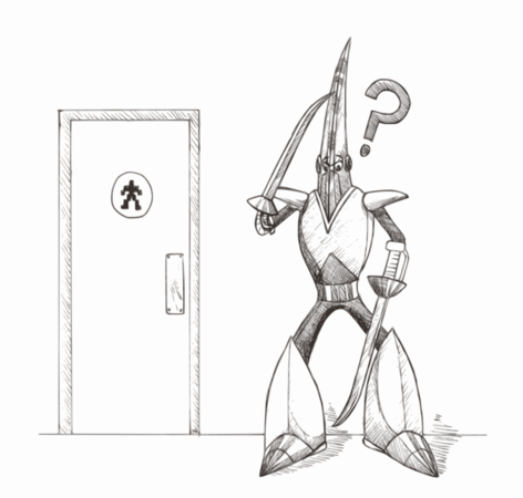 Why?! I don’t understand why Blade Man is standing right in front of the bathroom but I like the creative idea. I like it because it’s bizarre. Also I like it because the Blade Man looks cute and calm. One thing that’s going to be a problem for this Blade Man is that his head is too tall to get into the restroom, how will he fit?!