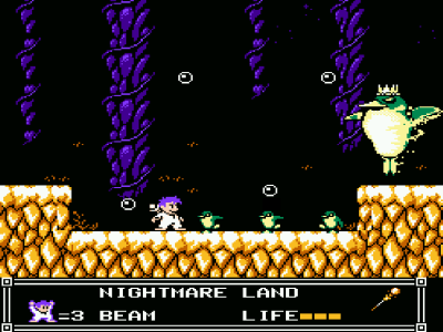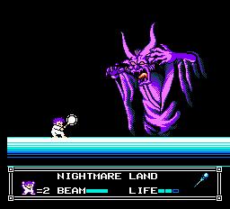At the heart of Little Nemo is a game about a child. You’re not a super powered hunk of bullets tearing through walls painted with alien brains, And you’re not some ace pilot sent to save the country from terrorists. You’re just a kid playing around in his own imagination. It’s something we could all relate with at the time, and even now we can still sit down and play the game and remember back to when we were kids. (A time when we could go outside and become ninja bear wrestlers without being considered a menace to society) But not all was well in Slumberland! You had to have a way to protect yourself from the strange nightmare creatures, and Nemo took a very strange approach for it’s time. Candy and friendship! Instead of eating your enemies and gaining their power like some sort of pink highlander you offered candy to strange dream creatures to gain their trust. Then you hopped on their backs and you were on your way! I feel this was a great thing for it’s time. With so many games pushing violence and danger, Nemo stood tall and made you treat others with respect and dignity. Until you reach Nightmare Land of course. You then use a magical scepter to slay the Nightmare King.