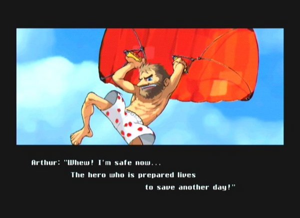 Just as insteresting as what little story we get are the characters, like Red Arremer. How many generic badguy types in video games manage to get their own game? Much less their own trilogy like Red Arremer did. Poison is the most popular (once) generic video game baddy I know of and even he/she hasn’t pulled that one off. Then there’s the main character himself, a simple character but with a lot of recognizable little traits. The infinite lances, the armor (especially the special “Super Ghouls N Ghosts” versions), and of course the heart-print boxers. It’s no wonder he makes cameos in games like MvC, Cammy’s Cannon Spike (arguably my favorite look of his), and We Love Golf.