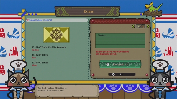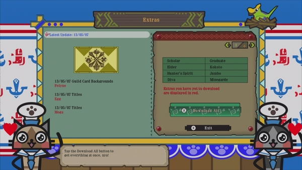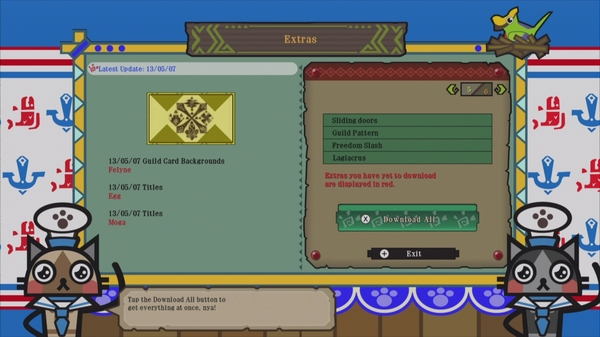 Have you been keeping up with the Monster Hunter 3 Ultimate DLC Quests? They’ve been coming up every Tuesday since launch, for free! So head on to the DLC menu and find some Event and Challenge Quests and even some neat little Extras that are just waiting to be downloaded.