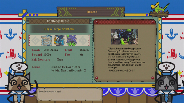 While today’s quests are both G-Rank (and they are pretty cool – Challenge Quest below) there are plenty of other Low- and High-Rank quests in the catalog.