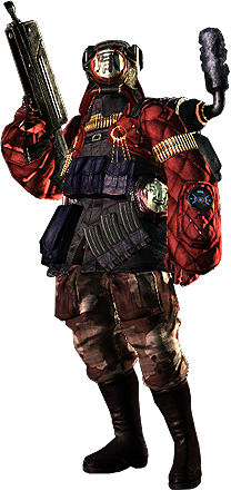 Lost Planet 2 offers something that will keep you occupied and satisfied the entirety of the game: Customizing your character. First off, your character is yours to create and customize , and you can bring that character everywhere you go, whether that be online in the versus modes, into the co-op campaign, or even the training modes. The game is loaded with various factions, all with their own cultures. You’ll be getting parts to these characters as you play, and it’s all interchangeable. You’ll be able to swap out heads/helmets, torso/armor, backpacks/t-eng canisters, and their legs/boots. Not only that, but each of those pieces has various colors and patterns to choose from.